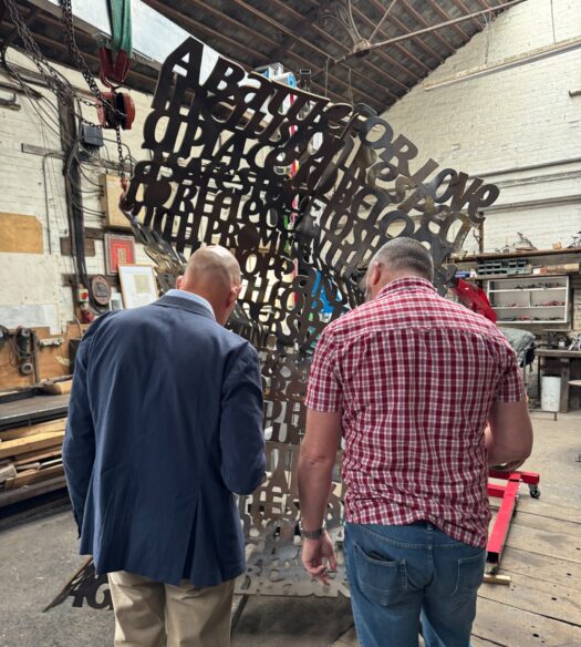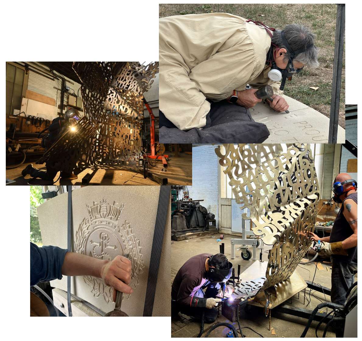 The memorial construction takes place at the studios of Abraxas Academy in Norfolk, where the bronze letter is folded, welded and polished and the stone base dedications and crests are carved